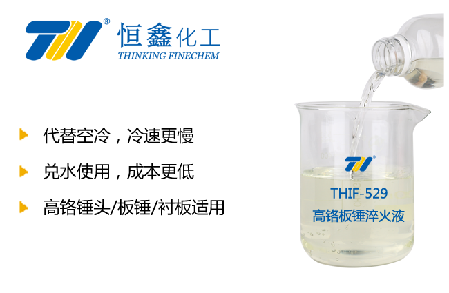 產品簡介THIF-529高鉻板錘淬火液為水性溶液,無味,淬火后工件可達到硬度要求,且具有防銹、殺菌、防腐的功能,不易燃,無火災危險。使用時兌水稀釋,配置成一定的濃度,且對操作人員和環境無損害,不易老化,使用壽命長。產品特點①通過調整水溶液的濃度來滿足不同材料、不同尺寸工件的淬火冷卻,冷卻速度介于水和油之間。
